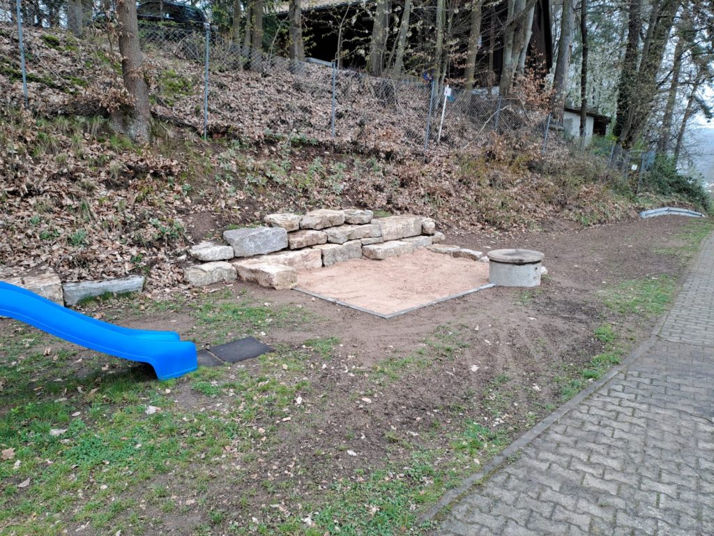 In den vergangenen Tagen ist so ein großer und individuell gestalteter Sandkasten entstanden. Dafür wurde der Hang abgetreppt. Der dafür benutzte Muschelkalk dient als Sitz-, Spiel- und Klettermöglichkeit. Der Revisionsschacht wurde als Spieltisch integriert.